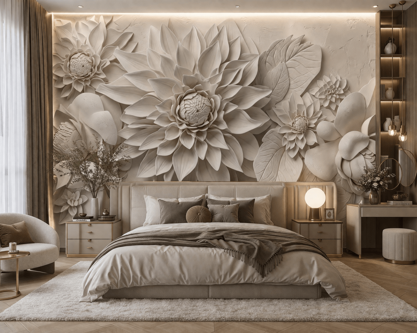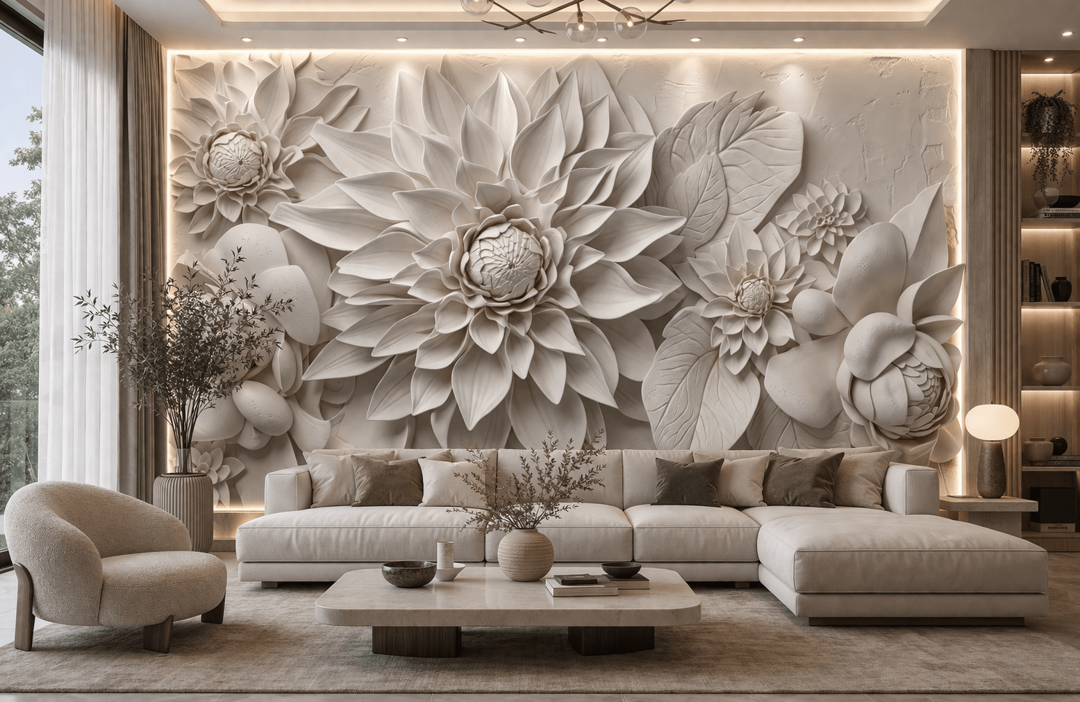 5D Kabartma Görünümlü Beyaz Dev Çiçekler Duvar Kağıdı, zarafet ve derinliği bir araya getiren etkileyici bir tasarımdır. Büyük ölçekli çiçek formları, katmanlı yaprak detayları ve taş dokulu yüzeyi sayesinde duvarda güçlü bir 5D kabartma etkisi oluşturur. Açık krem ve beyaz tonların uyumu ile mekana ferah, sade ve lüks bir atmosfer kazandırır. 5D Kabartma Görünümlü Beyaz Dev Çiçekler Duvar Kağıdı; salon, yatak odası ve oturma alanlarında modern ve şık bir odak noktası oluşturur.