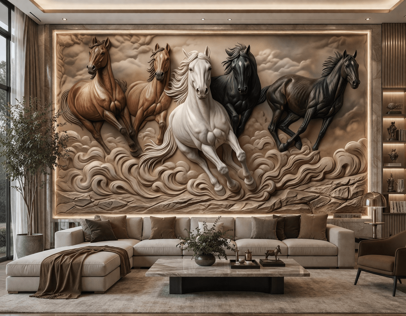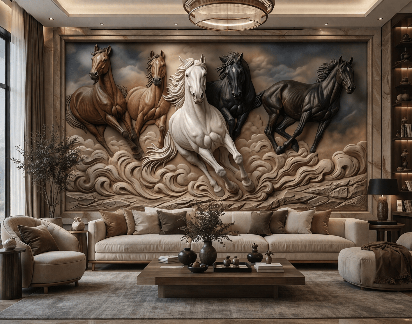 5D Kabartma Görünümlü Koşan Atlar Duvar Kağıdı, güçlü ve dinamik tasarımıyla yaşam alanlarınıza etkileyici bir karakter kazandırır. Detaylı at figürleri ve dalga formundaki zemin dokusu, duvar üzerinde gerçekçi bir 5D kabartma etkisi oluşturarak derinlik hissini maksimum seviyeye çıkarır. Kahverengi, siyah ve beyaz tonların uyumu ile hem klasik hem de modern dekorasyonlara uyum sağlar. 5D Kabartma Görünümlü Koşan Atlar Duvar Kağıdı; salon, oturma odası ve ofis gibi alanlarda dikkat çekici ve prestijli bir atmosfer oluşturur.
