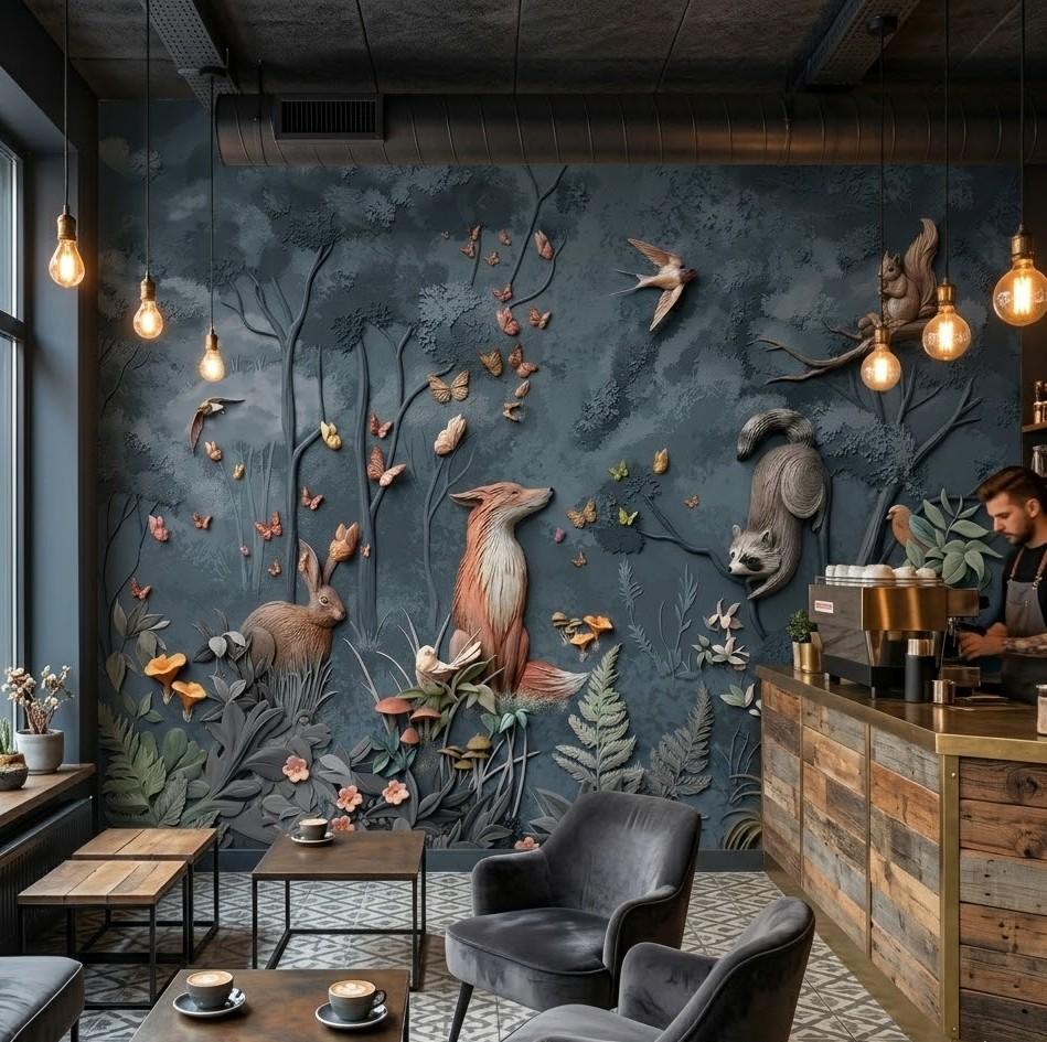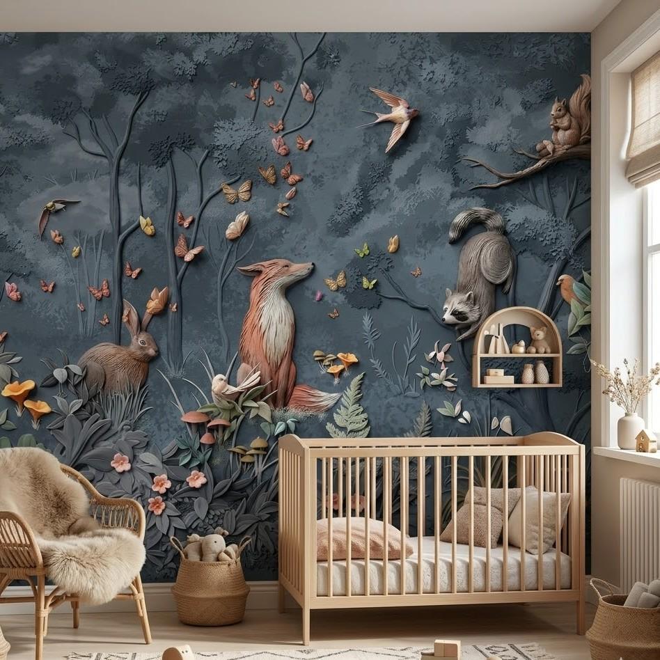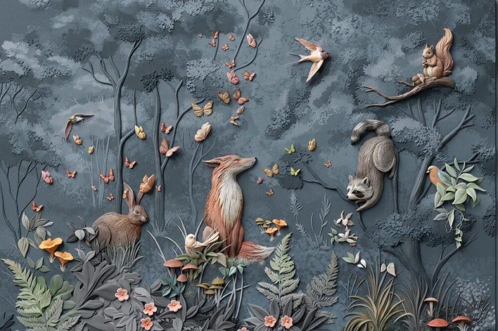 5D Kabartma Görünürlü Masalsı Orman Hayvanları Duvar Kağıdı. Evinizin veya iş yerinizin duvarlarını büyüleyici bir orman macerasına dönüştürün! Bu özel tasarım 5D kabartma görünümlü duvar kağıdı, odanıza derinlik ve karakter katmak için mükemmel bir seçimdir. Tilki, tavşan, rakun ve sincap gibi sevimli orman sakinlerinin, kelebekler ve kuşlarla dolu fantastik bir orman ortamında tasvir edildiği bu duvar kağıdı, sadece bir duvar kaplaması değil, aynı zamanda bir sanat eseridir. Çocuk odalarından modern oturma odalarına, hatta kafelere kadar her mekana sıcaklık ve neşe katacak bu 5D kabartma görünümlü duvar kağıdı ile duvarlarınız canlanacak.