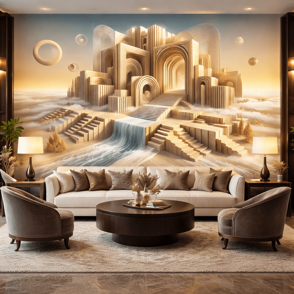 Altın Mimari Şelale 3D Duvar Kağıdı, altın tonlarında mimari yapılar ve şelale tasarımı ile hazırlanmış etkileyici bir 3D duvar kağıdı modelidir. Modern ve lüks dekorasyon tarzına uygun olan bu modern duvar kağıdı, özellikle salon duvar kağıdı, lüks duvar kağıdı, 3d manzara duvar kağıdı ve dekoratif duvar kağıdı arayanlar için oldukça şık bir duvar tasarımı sunar. Üç boyutlu mimari ve şelale efekti sayesinde duvarlarda derinlik hissi oluşturur ve mekânın daha geniş, ferah ve dikkat çekici görünmesini sağlar. Oturma odası, yatak odası, ofis, otel ve villa dekorasyonları için uygun bir duvar kağıdı modelidir.