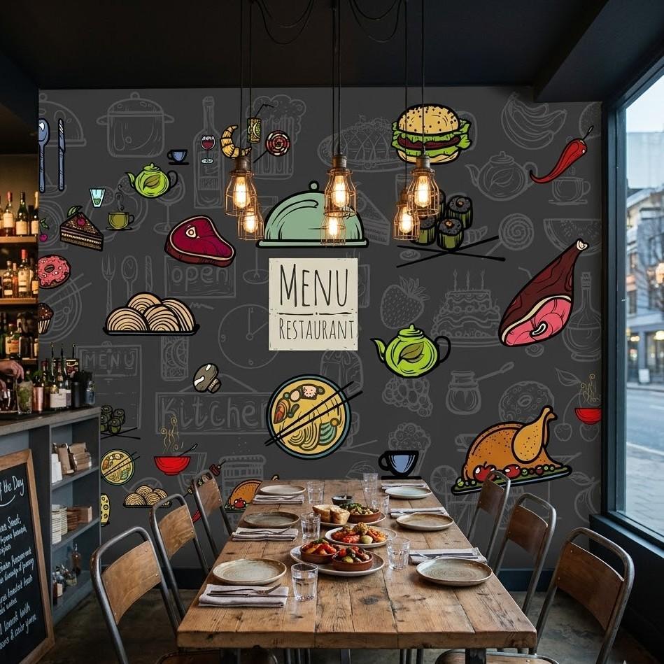 Restoranınızın atmosferini anında değiştirecek, iştah açıcı ve modern bir dokunuş mu arıyorsunuz? Lezzet Dolu Restoran Menü Duvar Kağıdı tam da ihtiyacınız olan şey! Bu özel tasarım duvar kağıdı, canlı renkleri ve el yapımı illüstrasyonları ile mekanınıza enerji ve kişilik katacak.