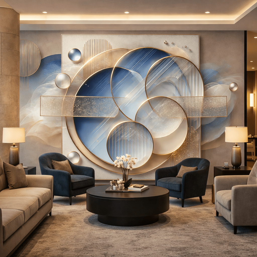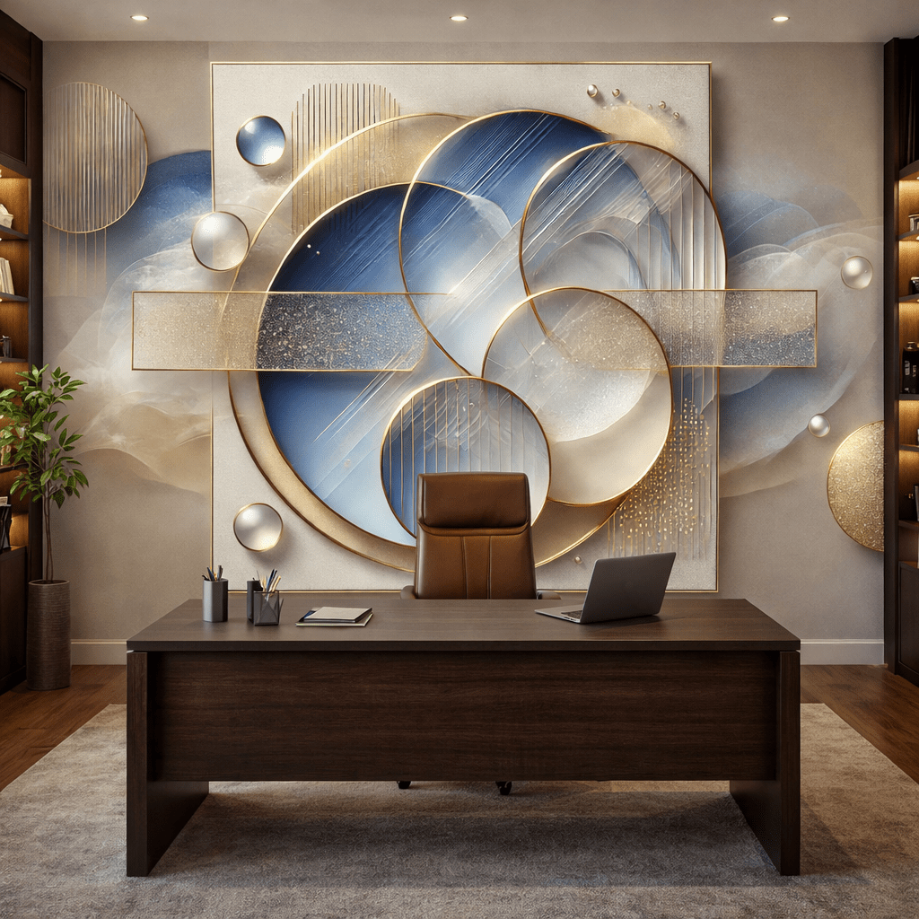 Mavi Altın Geometrik Daireler Duvar Kağıdı, mavi tonları ve altın detaylı geometrik daire tasarımı ile modern ve lüks dekorasyon tarzına uygun özel bir geometrik duvar kağıdı modelidir. Modern iç mekân tasarımlarında sıkça tercih edilen bu modern duvar kağıdı, özellikle salon duvar kağıdı, ofis duvar kağıdı, lüks duvar kağıdı ve 3d duvar kağıdı arayanlar için şık ve dekoratif bir duvar tasarımı sunar. Altın çizgiler ve geometrik daireler sayesinde duvarlarda derinlik hissi oluşturur ve mekânın daha modern, ferah ve estetik görünmesini sağlar. Oturma odası, ofis, otel, bekleme salonu ve mağaza dekorasyonları için uygun bir dekoratif duvar kağıdı modelidir.
