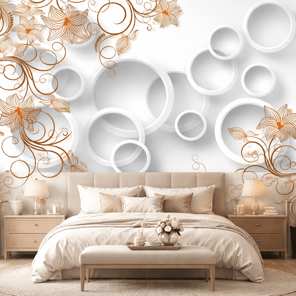 Modern Altın Çiçekli Halkalar Duvar Kağıdı, zarif çiçek desenleri ve üç boyutlu halka detaylarıyla yaşam alanlarınıza lüks ve estetik bir hava kazandırır. Altın tonlarının şıklığı ile sade gri zemin mükemmel bir uyum yakalayarak hem modern hem de klasik dekorasyon stillerine kolayca adapte olur. Salon, yatak odası, kafe ve ofis gibi birçok alanda kullanıma uygun olan bu tasarım, mekânı daha geniş ve ferah gösterirken dekorasyonunuza sofistike bir dokunuş sağlar.