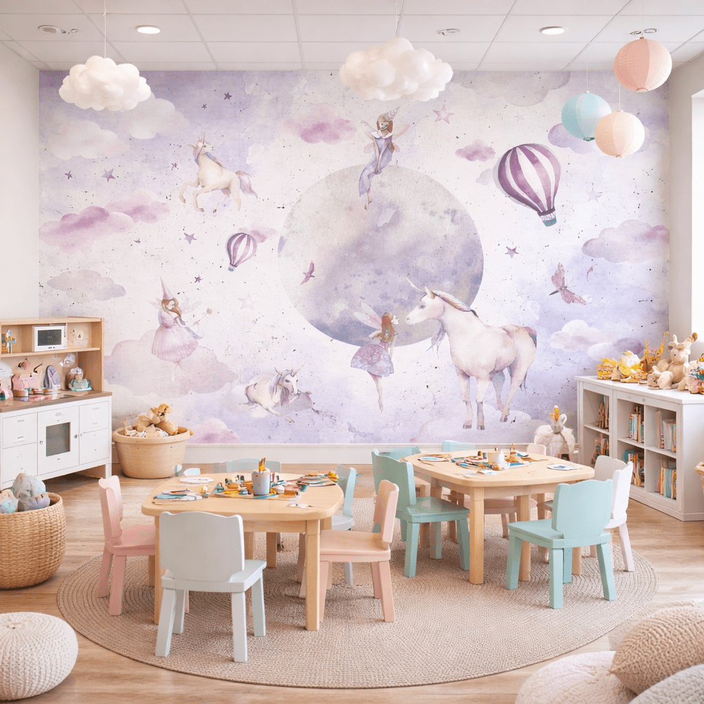 Peri Masalı Unicorn ve Ay Desenli Çocuk Odası Duvar Kağıdı, pastel tonların büyüleyici uyumu ile çocuk odalarına hayal dolu bir atmosfer kazandırır. Uçuşan periler, sevimli unicorn figürleri, bulutlar ve gökyüzünde yer alan büyük ay detayı sayesinde duvarlar adeta masalsı bir dünyaya dönüşür. Yumuşak renk geçişleri ve huzur veren tasarımıyla çocukların hayal gücünü desteklerken, kreş, anaokulu ve çocuk odalarında sıcak ve eğlenceli bir ortam oluşturur. Modern baskı kalitesi ile hem dekoratif hem de uzun ömürlü kullanım sunar.