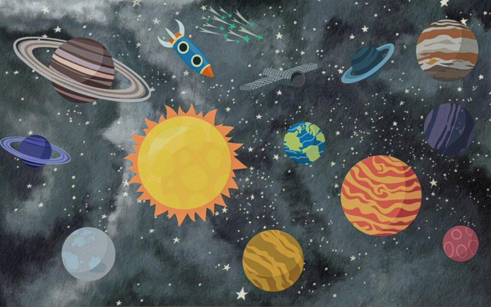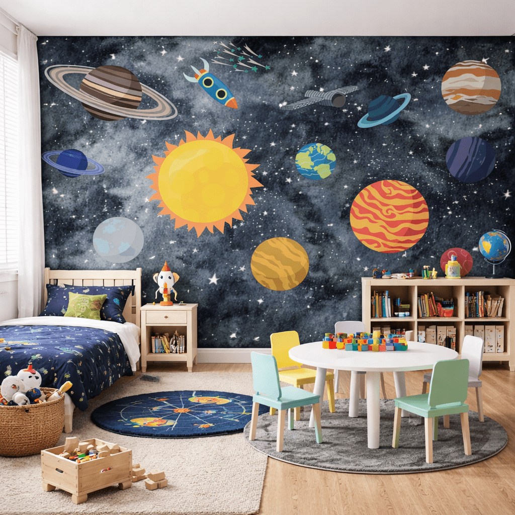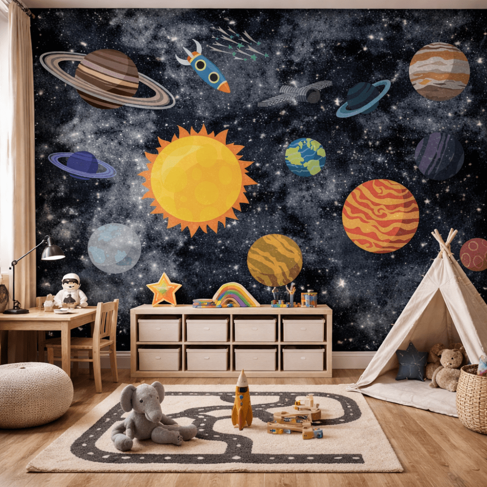 Renkli Güneş Sistemi ve Gezegenler Çocuk Odası Duvar Kağıdı, eğlenceli ve öğretici tasarımıyla çocukların hayal dünyasını genişleten özel bir dekorasyon ürünüdür. Büyük ve dikkat çekici güneş figürü, etrafında konumlanan gezegenler, roket ve yıldız detayları ile duvarlarınızda canlı bir uzay atmosferi oluşturur. Renkli ve çizgi tarzındaki tasarım sayesinde çocukların ilgisini çekerken aynı zamanda eğitici bir görsel sunar. Çocuk odası, kreş ve oyun alanlarında kullanım için ideal olan bu duvar kağıdı, mekana enerji ve neşe katar. Yüksek çözünürlüklü baskı kalitesi ile uzun ömürlü ve net bir kullanım sağlar.