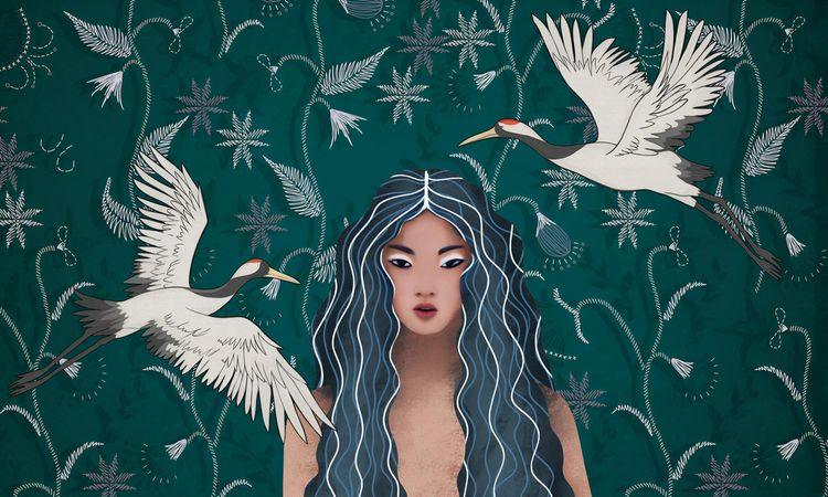 - Sanatsal kadın figürü ve turna kuşları ile özgün tasarım