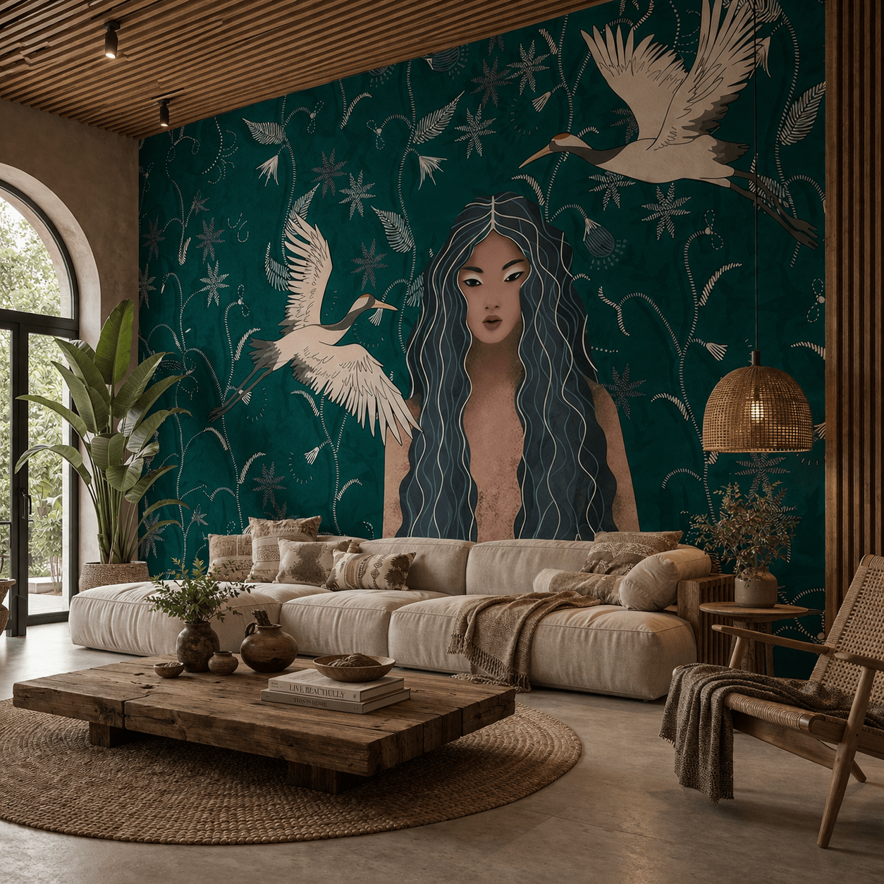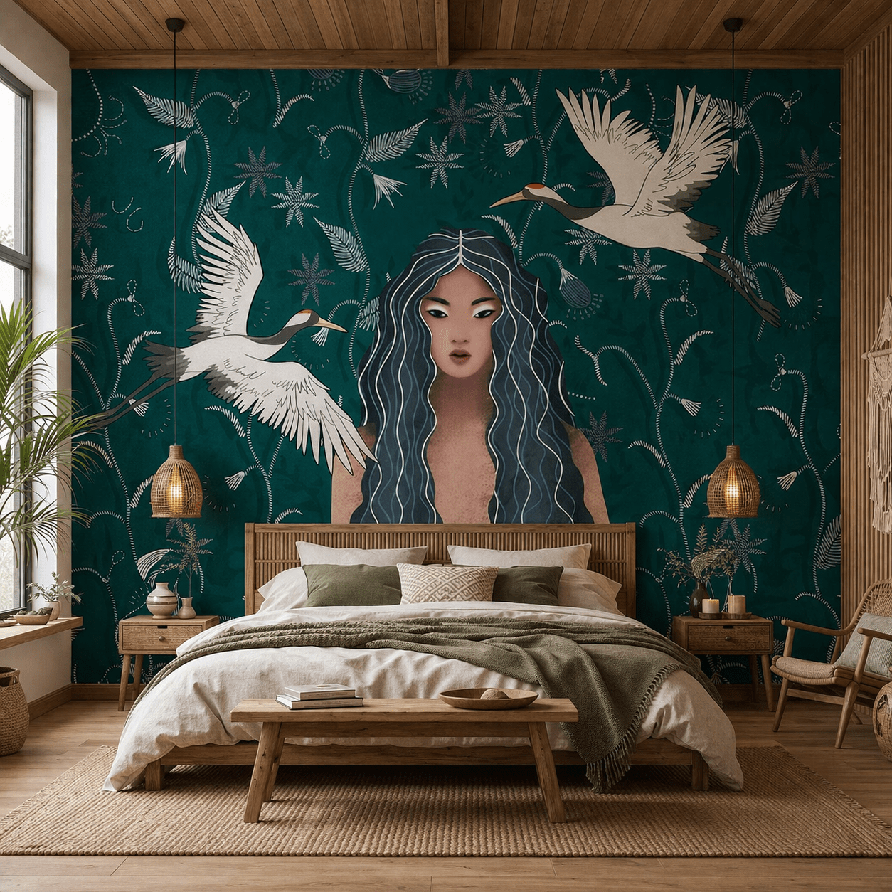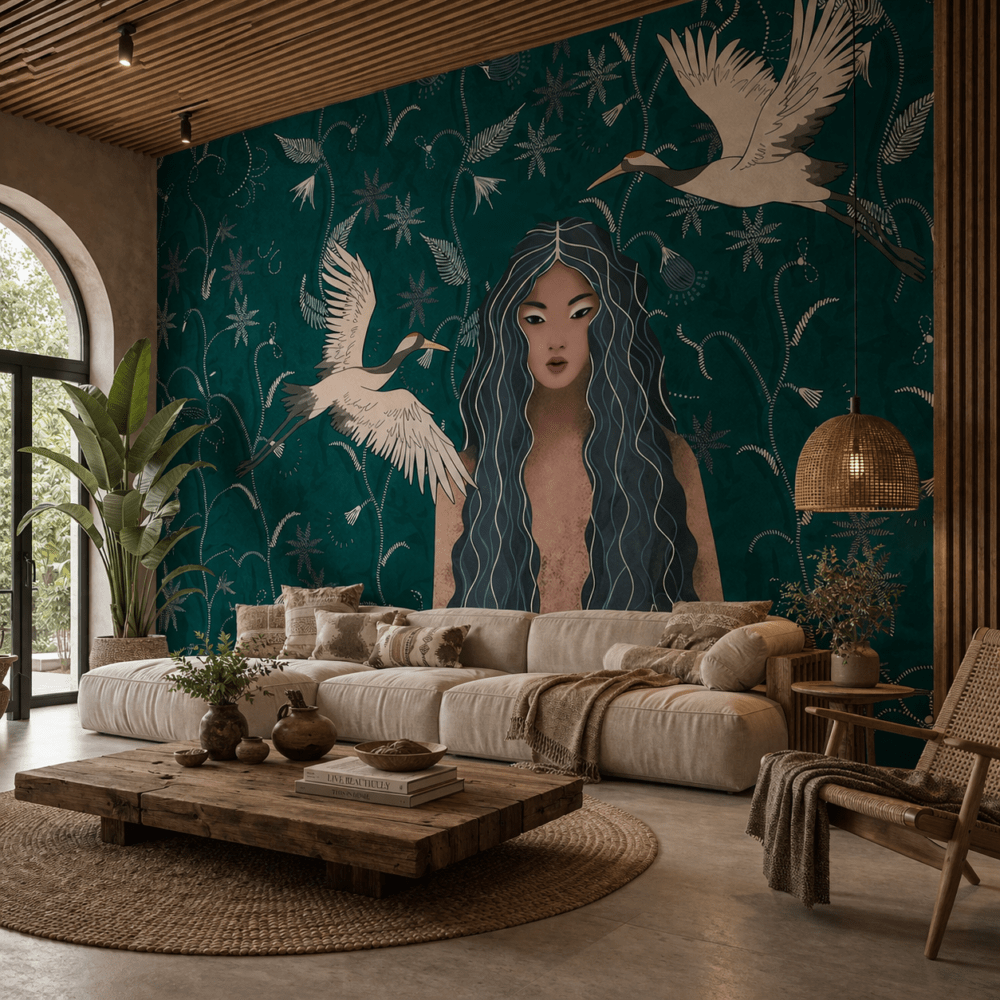 Zümrüt Turna ve Kadın Figürlü Duvar Kağıdı, sanatsal ve etkileyici tasarımıyla yaşam alanlarınıza özgün bir karakter kazandırır. Derin zümrüt yeşili zemin üzerinde yer alan zarif kadın figürü ve uçuşan turna kuşları, doğa ile estetiğin kusursuz birleşimini sunar. Modern, bohem ve sanatsal dekorasyon tarzlarına mükemmel uyum sağlayan bu tasarım; salon, yatak odası ve özel yaşam alanlarında dikkat çekici bir odak noktası oluşturur. Zümrüt Turna ve Kadın Figürlü Duvar Kağıdı, duvarlarınıza derinlik, anlam ve sofistike bir atmosfer katar.